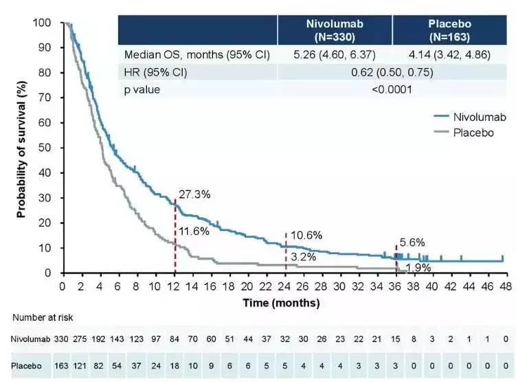 纳武利尤单抗组的1年OS率达到27.3%,安慰剂组为11.6%[2];2年随访后,OS率分别为10.6%和3.2%,研究组是对照组的3倍[2]。3年随访时,研究组的长期生存获益持续维持,3年OS率分别为5.6%和1.9%,而两组3年PFS分别为2.4%和0%[5]。