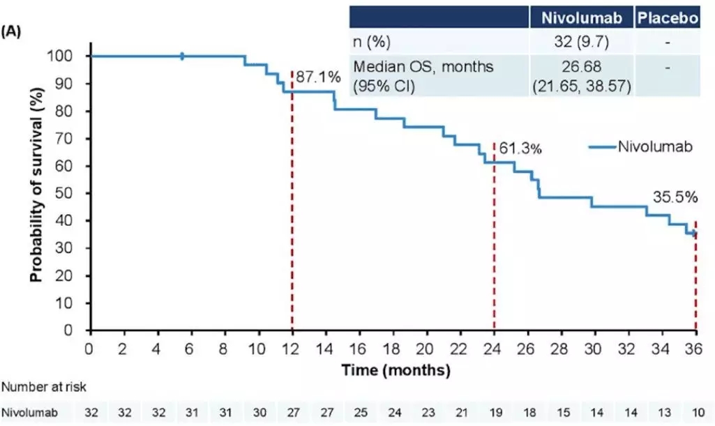 在达到完全缓解(CR)/部分缓解(PR)的患者人群中,1年OS率高达87.1%,2年OS率高达61.3%,3年OS率35.5%[2,5]。3年随访时,纳武利尤单抗组有32名(9.7%)患者获得CR或PR,研究根据基于最佳总体缓解(BOR)的OS亚组分析显示,获得CR或PR的患者中位OS达到26.68个月,生存时间超过了2年,对照组没有患者获得CR或PR[5]。即使是疾病稳定(SD)的患者,纳武利尤单抗组的中位OS在数值上也优于安慰剂组。
