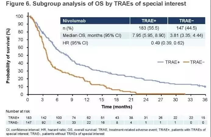 ATTRACTION-2研究中,纳武利尤单抗的安全性与既往实体瘤临床试验的报道一致。所有治疗相关的不良反应(TRAEs)发生率约为43%;3-4级不良反应发生率仅为10%[2]。首次治疗相关不良事件多在开始纳武利尤单抗治疗3个月内出现,多为皮肤反应和胃肠道反应,在后续的3年随访过程中未再发现新的治疗相关不良事件。早期发生TRAEs患者有更长的OS,出现特别关注TRAEs患者的中位OS是未发生TRAEs患者的2倍(7.95个月 vs 3.81个月),3年OS率超过10%(图3)[5]。