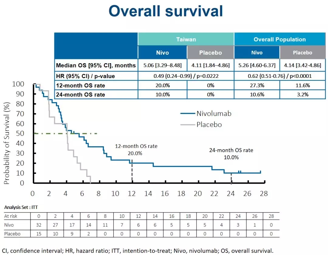 亚组分析结果显示,纳武利尤单抗组的ORR为12.5%(3例),含了4.2%的CR患者比率,安慰剂组ORR为0%;两组中位OS分别为5.06个月和4.11个月[6];纳武利尤单抗组的死亡风险与安慰剂组相比降低51%,HR为 0.62),明确了免疫治疗对于中国台湾地区亚组患者的附加价值[6]。纳武利尤单抗组的1年OS率为20.0%,2年OS率为10.0%,而安慰剂组这两个数据都为0%[6]。10%胃癌患者二线治疗失败后还能实现两年的生存,纳武利尤单抗针对有效人群体现出免疫治疗“生存拖尾效应”。