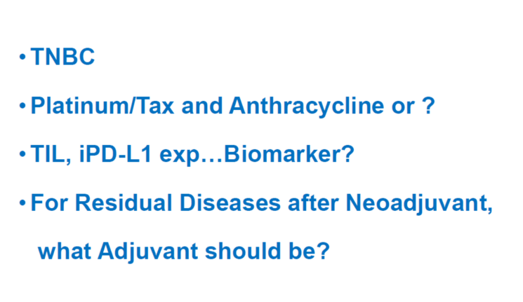 户井教授:免疫治疗已被写入日本晚期乳腺癌的治疗指南,间质的PD-L1作为晚期乳腺癌的肿瘤标志物,可用来指导是否使用免疫检查点抑制剂。对于辅助和新辅助应用免疫治疗,目前还处于临床试验阶段。我们目前正在进行免疫治疗用于新辅助治疗的临床试验,中期分析发现PD-L1并不是新辅助治疗的一个良好预测指标,在TNBC中似乎还稍稍有些趋势而已。所以我认为新辅助、辅助治疗和晚期治疗的体系是完全不同的。对于新辅助和辅助治疗阶段哪一种标记物可以预测疗效和远期生存还需进一步研究。