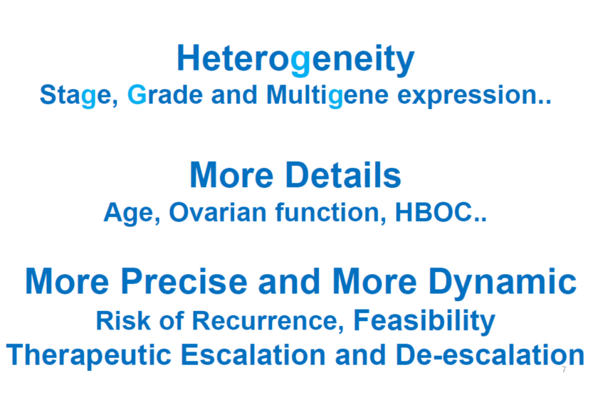 户井教授就“原发性乳腺癌(新)辅助治疗的升降阶梯治疗策略”相关问题进行了讲解和介绍。他表示,乳腺癌是异质性较强的疾病,在治疗上也应更加细化、更加精准和更加动态化。其异质性表现在分期、组织学分级和多基因表达等方面,我们应根据患者的年龄、卵巢功能等情况对乳腺癌患者进行复发风险的评估和升阶梯和降阶梯治疗策略的改变。