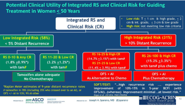对于luminal型乳腺癌患者的辅助治疗,有研究在探讨降阶梯治疗,筛选化疗获益人群,以期做到更为精准的治疗。TAILORx研究评估了早期乳腺癌患者年龄和21基因复发风险评分对化疗疗效及预后的预测作用。2019年ASCO会议上,TAILORx二次分析的结果披露。在年龄41~50岁且RS评分16-25分的绝经前患者中,化疗可以获益;对年龄小于50岁且RS评分为16-25的患者,临床危险分层有助于对化疗绝对获益进行更精确的估计,将RS评分和临床风险评估相结合的综合风险评估可能在年龄≤50岁的绝经前患者中得到更好的临床应用。