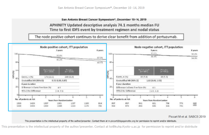 APHINITY研究旨在评价HER2阳性早期乳腺癌患者辅助治疗中曲妥珠单抗(H)+化疗的基础上,联合帕妥珠单抗(P)是否能够进一步改善预后。APHINITY更新数据显示中位随访74.1个月整体人群的复发风险下降达24%,无浸润性复发生存率(iDFS)绝对获益从3年0.9%增加到6年2.8%,亚组分析提示,在淋巴结阳性的高危人群中,升阶梯的双靶治疗其6年iDFS为87.9%,相对曲妥珠单抗单靶组83.4%,绝对获益达到4.5%。通过更长时间的随访进一步证实了帕妥珠单抗联合曲妥珠单抗在辅助治疗中的获益优势。