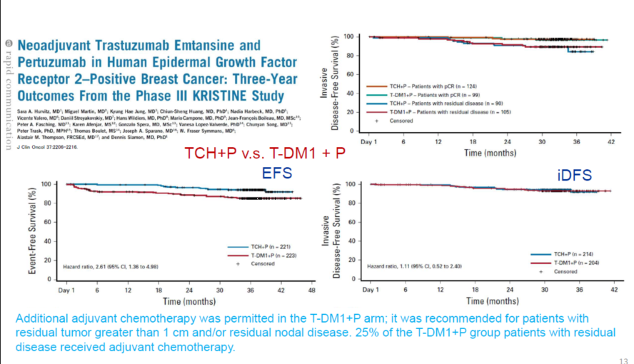 对于术前应用T-DM1有残余的患者怎么做加法,到目前为止是追加曲妥珠单抗。术前应用T-DM1的患者有一部分对环磷酰胺和蒽环类药物敏感,但是临床试验和实际操作是有区别的,临床实践中还要谨慎。