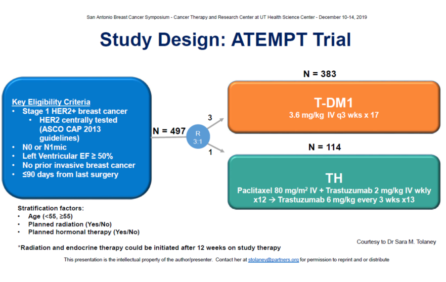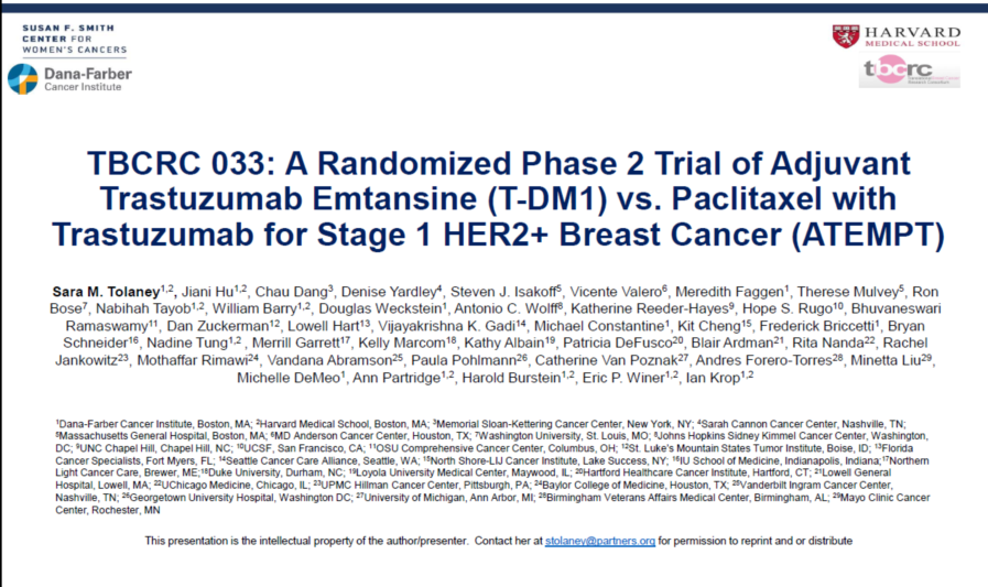 既往针对HER2阳性小肿瘤(T≤3cm)患者的APT研究显示辅助TH治疗部分HER2阳性乳腺癌的3年无病生存(DFS)率为98.7%,ATEMPT研究结果显示TH组的3年DFS率为92.8%,T-DM1组的复发事件数较少,3年DFS率为97.7%,且不良反应无显著增加。这提示如果患者对TH方案不耐受,T-DM1可以作为TH方案的替代选择,体现了降阶梯治疗的价值和意义。