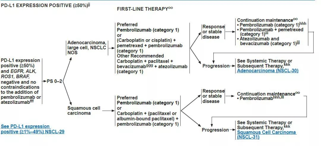 NCCN指南:在NCCN指南中,对于PD-L1≥50%患者,单药Pembrolizumab作为I类优先推荐,联合化疗同样作为I类推荐,但只是普通推荐,并不是作为优先推荐。所不同的是联合的化疗方案有所不同,腺癌联合的方案为培美曲塞联合卡铂,而鳞癌推荐联合的方案是紫杉醇/白蛋白结合型紫杉醇联合卡铂(图4)