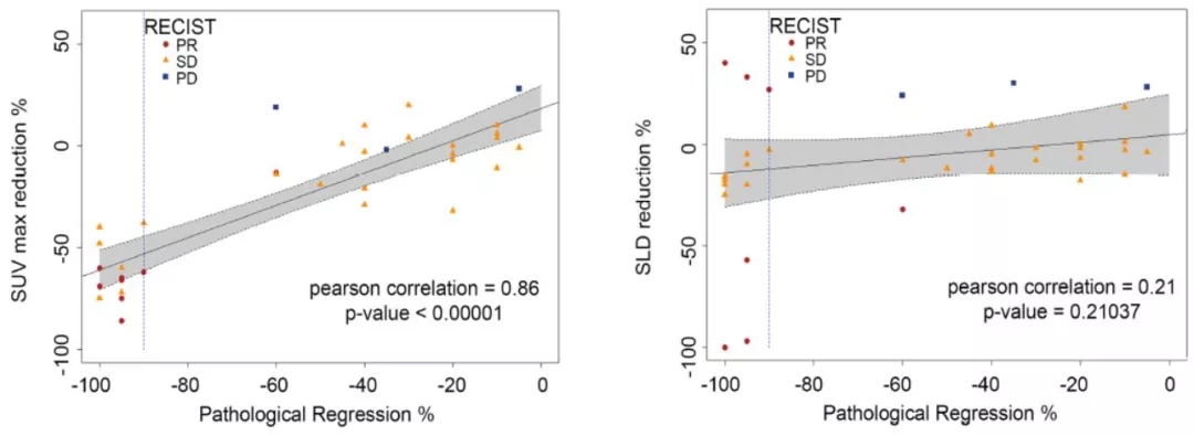 图2. 病理学缓解与SUV及病灶直径的相关性