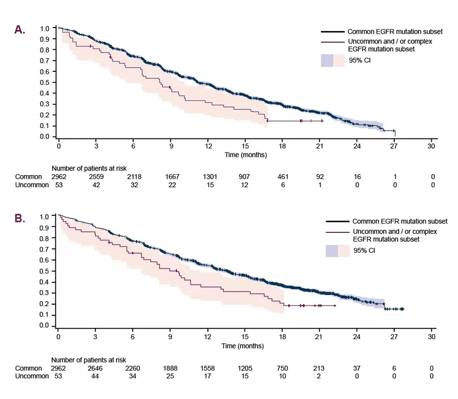 图2. 常见EGFR突变和罕见和/或复杂EGFR突变患者接受奥希替尼治疗的PFS(A)和至治疗终止时间(TTD)(B)
