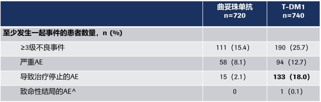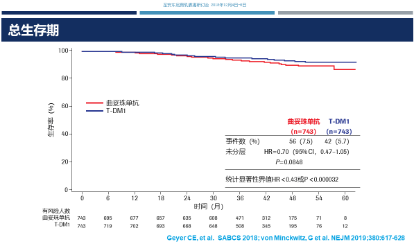 总生存:曲妥珠单抗组vs T-DM1组的事件数是56 vs 42,未分层风险比是0.7,当然我们还需要进一步随访,等待OS的成熟。