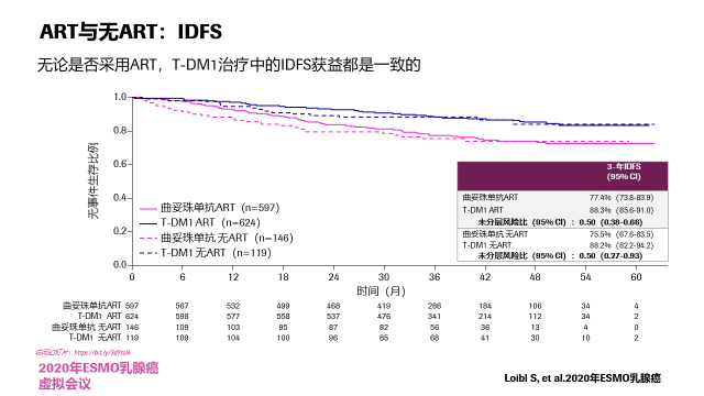 在今年的ESMO-Breast cancer会议上,我们报道了这样一个结果,对KATHERINE研究中新辅助治疗后non-pCR患者的手术标本重新进行免疫组化检查发现,在70例残留病灶HER2检测阴性的患者中,42例随机分配接受曲妥珠单抗治疗的患者发生了11例iDFS事件,28例随机分配接受T-DM1治疗的患者发生了0例IDFS事件,这再次证明了这些患者是可以从T-DM1的研究中获益的,与我们之前的试验结果是一致的,这对于临床是很有意义的结果。