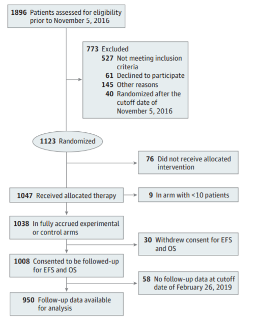 研究入组患者为临床上可手术的2或3期乳腺癌,既往无乳腺癌手术或全身治疗;原发肿瘤为2.5 cm或更大。排除ERBB2-/HR+且70基因检测分数低的肿瘤患者。从2010年3月到2016年,参与者被自适应随机分配到几种不同的研究方案或分子亚型的对照治疗中。本次分析为截至2019年2月26日的随访数据。主要终点是pCR和3年EFS、DRFS。
