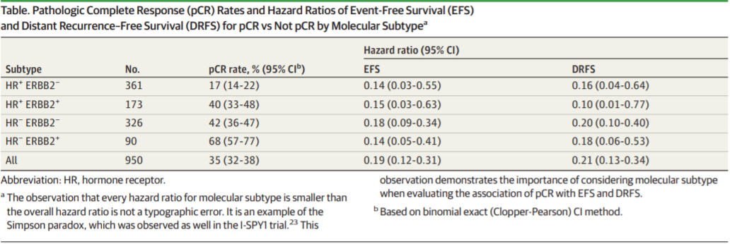 在生存获益方面,获得pCR的患者,其3年EFS和DRFS均为95%。pCR与non-pCR患者的EFS风险比分别为0.19(95%CI:0.12~0.31)和0.21(95%CI:0.13~0.34),并且在不同的分子亚型中相似,EFS的风险比均在0.14-0.18之间,DRFS风险比在0.10-0.20之间。