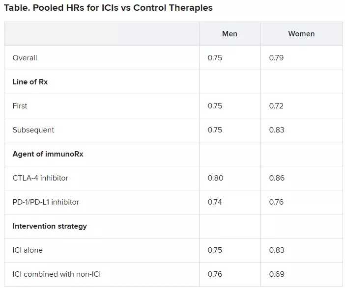 该荟萃分析包括37项随机临床试验,共涉及23,760名不同类型癌症的晚期患者,大多数为III期(n=34)以及后线治疗(n=22)的临床试验。使用ICI治疗的最常见癌症类型是非小细胞肺癌和黑色素瘤。根据性别、年龄(<65岁和≥65岁)以及ECOG PS评分(0和1或更高),对总生存(OS)的危险比(HRs)进行汇总分析。根据癌症类型、治疗线数、使用的ICI以及ICI用药策略进行分层。大多数评估的药物是PD-1抑制剂和PD-L1抑制剂,包括ipilimumab、tremelimumab、nivolumab、pembrolizumab、atezolizumab、durvalumab和avelumab。