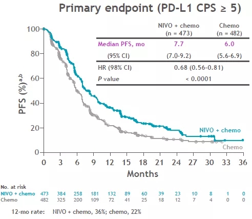 在PD-L1表达阳性即联合阳性评分(CPS)≥5的患者中,纳武利尤单抗联合化疗组的中位OS(风险比[HR]:0.71;98.4%可信区间[CI]:0.59~0.86;P<0.0001)为14.4个月(95%CI:13.1~16.2),对照的单独化疗组为11.1个月(95%CI:10.0~12.1)。纳武利尤单抗联合化疗组的中位PFS(HR:0.68;98%CI:0.56~0.81;P<0.0001)为7.7个月(95%CI:7.0~9.2),单独化疗组为6.0个月(95%CI:5.6~6.9)。在此项研究中,纳武利尤单抗联合化疗的安全性特征与已知的纳武利尤单抗及化疗的安全性特征一致,未观察到新的安全性信号。