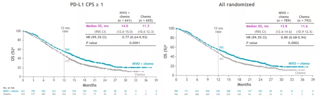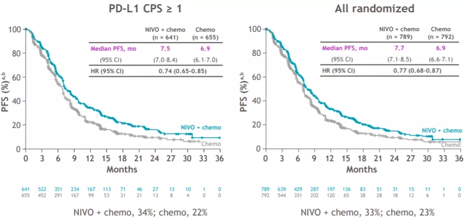 研究结果显示,在PD-L1阳性且CPS≥1的患者和所有随机人群中,纳武利尤单抗联合化疗也均显示出具有显著统计学意义的OS获益。在所有随机人群中,纳武利尤单抗联合化疗组患者的中位OS为13.8个月(95%CI:12.6~14.6),单独化疗组患者为11.6个月(95%CI:10.9~12.5) (HR:0.80;99.3%CI:0.68~0.94;P=0.0002)。在PD-L1阳性且CPS≥1的患者中,纳武利尤单抗联合化疗组患者的中位OS为14.0个月 (95%CI:12.6~15.0) ,单独化疗组患者为11.3个月 (95%CI:10.6~12.3) (HR:0.77;99.3%CI:0.64~0.92;P=0.0001) 。