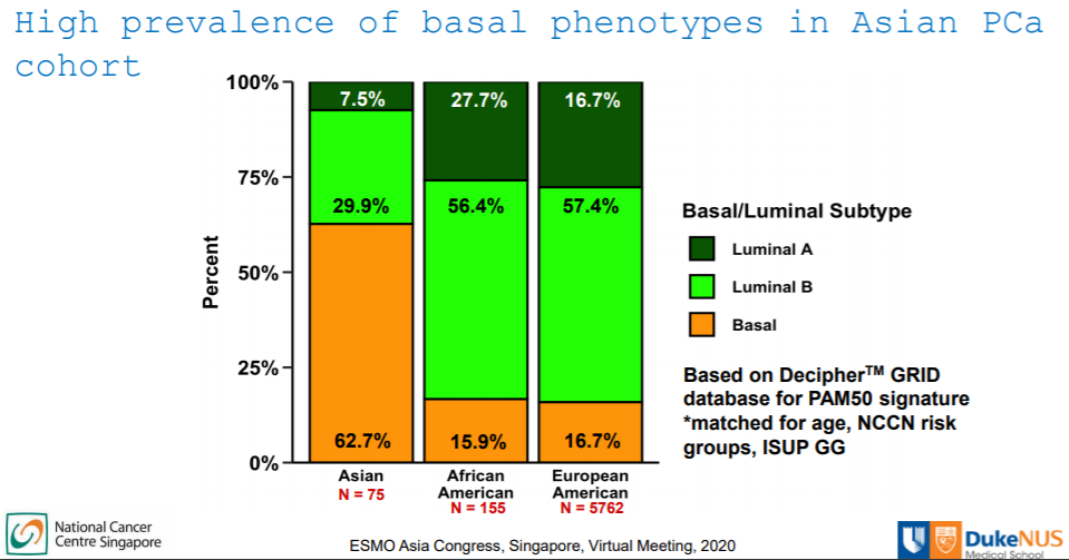 ESMO Asia会议中报道了亚洲前列腺癌应用基因预测工具的初步经验,31例东亚地区的前列腺癌患者进行了Decipher的基因表达谱检测,并针对NCCN危险度分组、Gleason评分和基底腺泡亚型进行了分析。研究结论提示东亚人群前列腺癌具有特定的基因分型特征,比如ETS+/ERG+/SPINK1+所占比例较小,这和文献中报道数据类似。