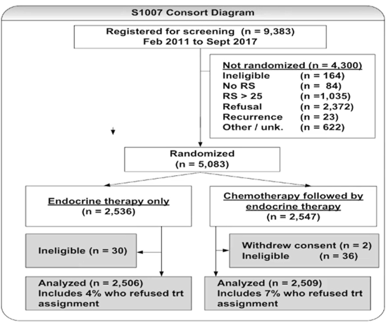 研究纳入HR+、HER2-、淋巴结1-3枚阳性、RS≤25分的乳腺癌患者,随机分为化疗序贯内分泌治疗和单纯内分泌治疗组。50%患者接受TC方案(4或6周期)化疗,其余接受蒽环为基础的化疗方案。主要研究终点是评估淋巴结1-3枚阳性、RS≤25分,化疗患者的无浸润生存期iDFS。次要研究终点是总生存(OS)、无远处转移生存(DDFS)和毒性等。