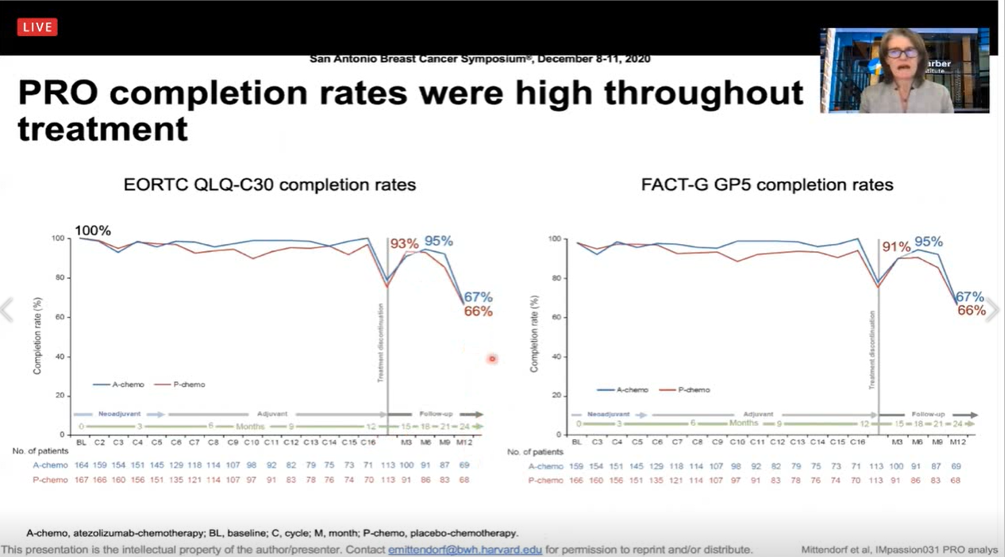 IMpassion031研究显示无论PD-L1表达,atezolizumab+化疗均显著提高了主要研究终点病理完全缓解(pCR)。本次大会报道了PROs,从患者角度全面评估临床效益和决策。