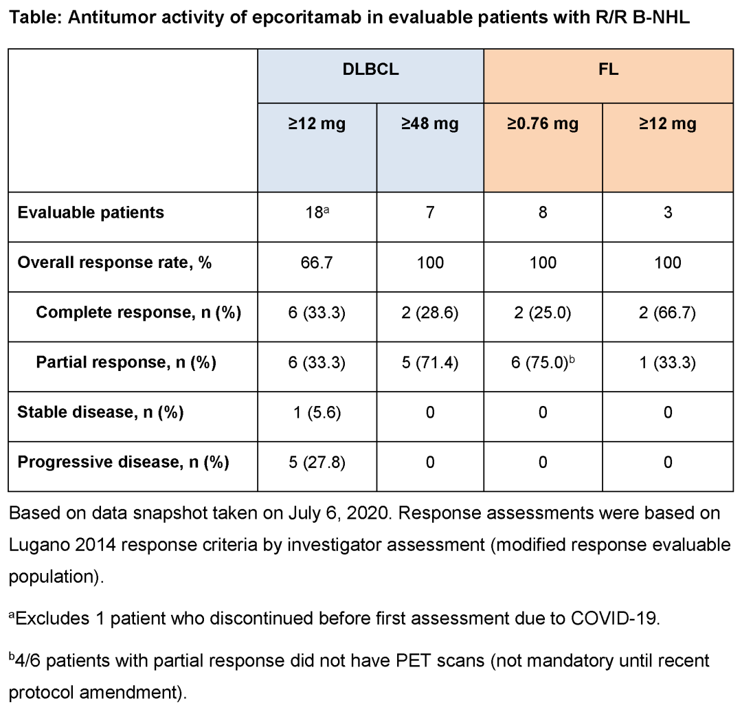 截至2020年7月6日,共入组了67例患者。患者接受了强化预治疗,DLBCL患者的中位(范围)既往治疗线数是3.0(1-6),FL患者是4.5(1-18);共有6位患者既往接受过CAR-T治疗。在中位总体随访8.3个月时,25例患者(37%)正在接受治疗;DLBCL患者的中位随访时间为8.3个月,FL患者为8.8个月。Epcoritamab的耐受性良好,未因治疗相关不良事件(AEs)而停药。