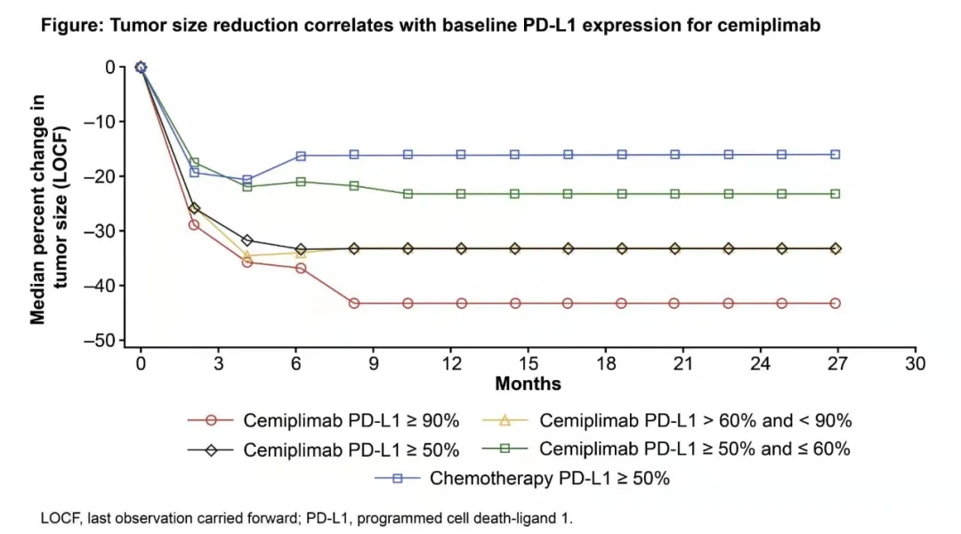 总的来说,Cemiplimab组的获益(OS、PFS和ORR)优于化疗组,且获益与PD-L1表达水平呈递增关系。因此,基线PD-L1表达水平可用于鉴别最有可能从一线Cemiplimab单药治疗中获益最大的晚期NSCLC患者。