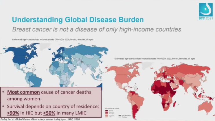 乳腺癌是全球所有国家的公共卫生方面共同面临的一大难题。但生活在LMIC的女性与生活在HIC的女性相比,预后明显较差。在一些高收入国家,患者的生存率>90%,而在许多中低收入国家诊断较早的一些女性中,患者接受的护理质量较差,因而其5年生存率低于50%,并且在治疗过程中经常出现经济危机。
