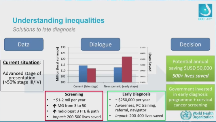 随着近年来各种社会因素和经济因素的影响,中低收入国家未能在乳腺癌治疗和预防方面做出投资,这一结果对社会凝聚力、经济繁荣和实现《2030年联合国可持续发展议程》中所列的全球目标带来了挑战。因此,加快乳腺癌预防和控制方面的进展必须成为各国政府和合作伙伴的优先事项。