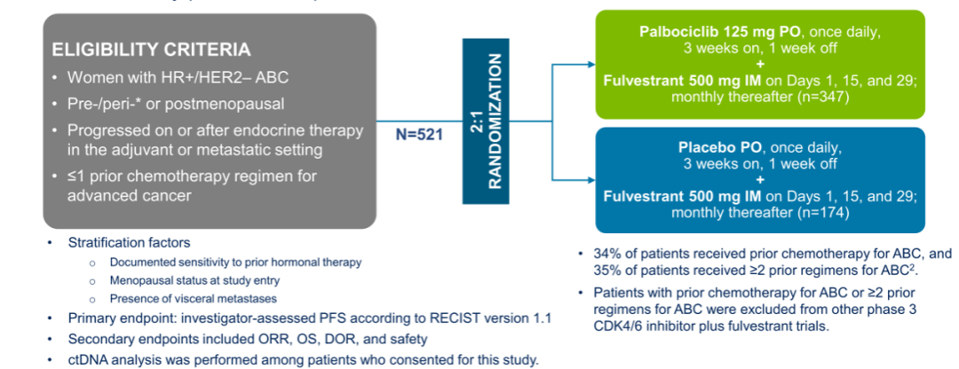 方法:共有521例接受过内分泌治疗进展的HR+/HER2-ABC患者按2:1的比例随机分为PAL(125mg/d 口服,3/1周方案)+FUL(500mg 肌肉注射)或PBO+FUL。研究者评估的PFS为主要终点;OS是关键的次要终点之一。当观察到393个事件(占总人数的75%)时,进行特定的OS分析。循环肿瘤DNA(ctDNA)分析在同意本研究的患者中进行。