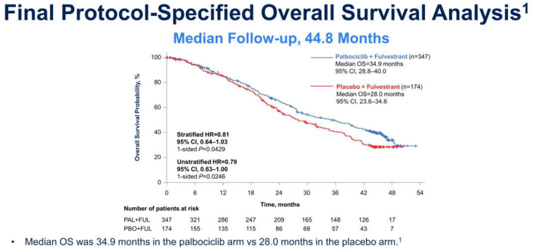 PALOMA-3是针对既往接受过内分泌治疗进展的HR+/HER2-晚期乳腺癌患者的一项前瞻性,全球多中心,随机双盲,安慰剂对照的Ⅲ期临床研究。入组了来自17个国家,144个研究中心的HR+/HER2-晚期乳腺癌(n=521)既往接受内分泌治疗进展的患者,以2:1随机分配到Palbociclib(125mg/d orally 3/1week schedule)联合氟维司群治疗组(n=347)或安慰剂联合氟维司群治疗组(n=174)。主要研究终点为无进展生存期(PFS),关键的次要研究终点为总生存期(OS)。2016年Lancet Oncology首次发布的研究结果表明,Palbociclib联合氟维司群与安慰剂联合氟维司群的中位PFS分别为9.5个月vs 4.6个月, PFS显著延长(HR=0.46, 95% CI:0.36~0.59,P<0.0001)。2018年新英格兰医学杂志更新了中位随访时间为44.8个月的研究结果,显示Palbociclib联合氟维司群对比安慰剂联合氟维司群,OS显著获益(34.9个月vs 28个月;HR=0.814,95%CI:0.644~1.029,P=0.0429)。