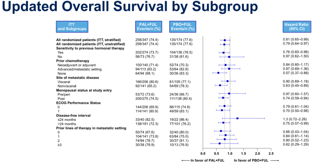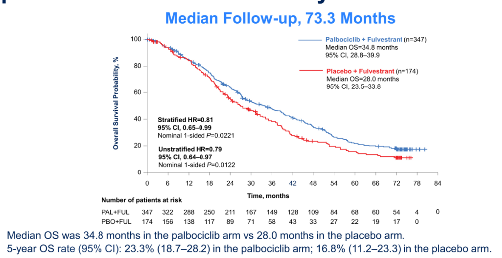 本次ASCO大会公布了最新的研究结果,中位随访时间更新至73.3个月,总生存期持续得到改善(HR=0.806;95%CI:0.654~0.994;P=0.0221)。Palbociclib联合氟维司群组的5年总生存率为23.3%(95%CI:18.7~28.2),明显高于安慰剂联合氟维司群组的16.8%(95%CI:11.2~23.3)。无论年龄,种族,绝经情况,以及内脏转移情况,Palbociclib联合氟维司群治疗组的中位OS均明显延长于安慰剂联合氟维司群治疗组。值得关注的是,在复发前的既往内分泌治疗敏感的患者,Palbociclib联合氟维司群治疗组对比安慰剂联合氟维司群,中位OS绝对获益达10个月(39.7个月vs 29.5个月);然而,这些生存获益并没有在原发性内分泌抵抗患者中实现。