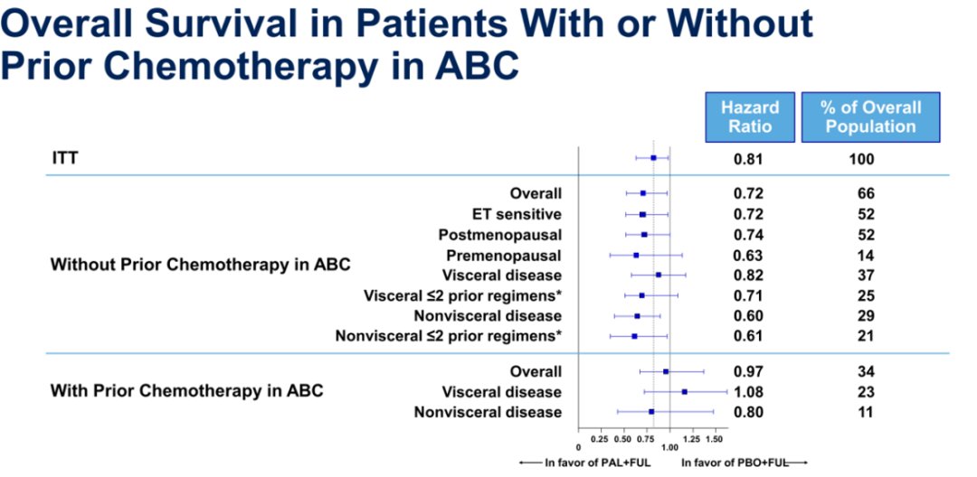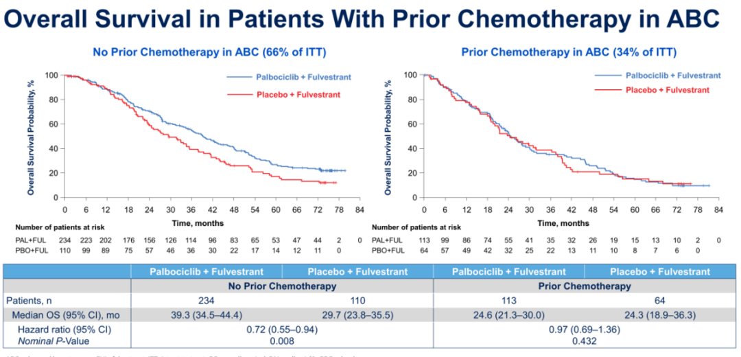 该结果提示Palbociclib的疗效反应是基于HR+/HER2-晚期乳腺癌内分泌治疗耐药的类型,对于内分泌耐药的HR+/HER2-晚期乳腺癌患者,Palbociclib能够大幅度增强氟维司群对此类患者的治疗疗效,从而达到更好的生存获益。更为有趣的是,既往未接受化疗的患者,Palbociclib联合氟维司群治疗组对比安慰剂联合氟维司群治疗组,中位OS显著延长近10个月(39.3个月vs 29.7个月)。但是,这样欣喜的结果并没有在既往接受过化疗的患者中显现(24.6个月vs 24.3个月)。该结果提示,Palbociclib对未接受过化疗的既往内分泌治疗进展的HR+/HER2-晚期乳腺癌患者的疗效更优。