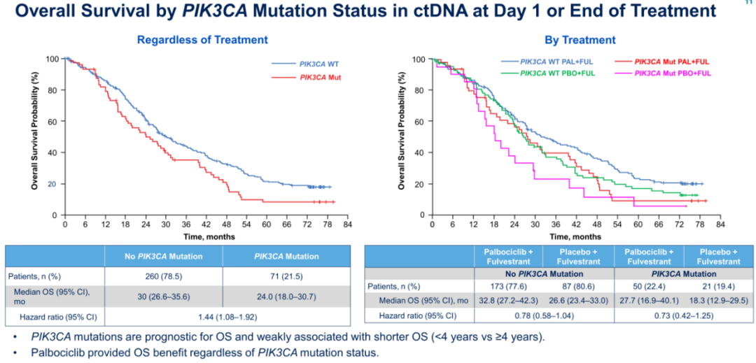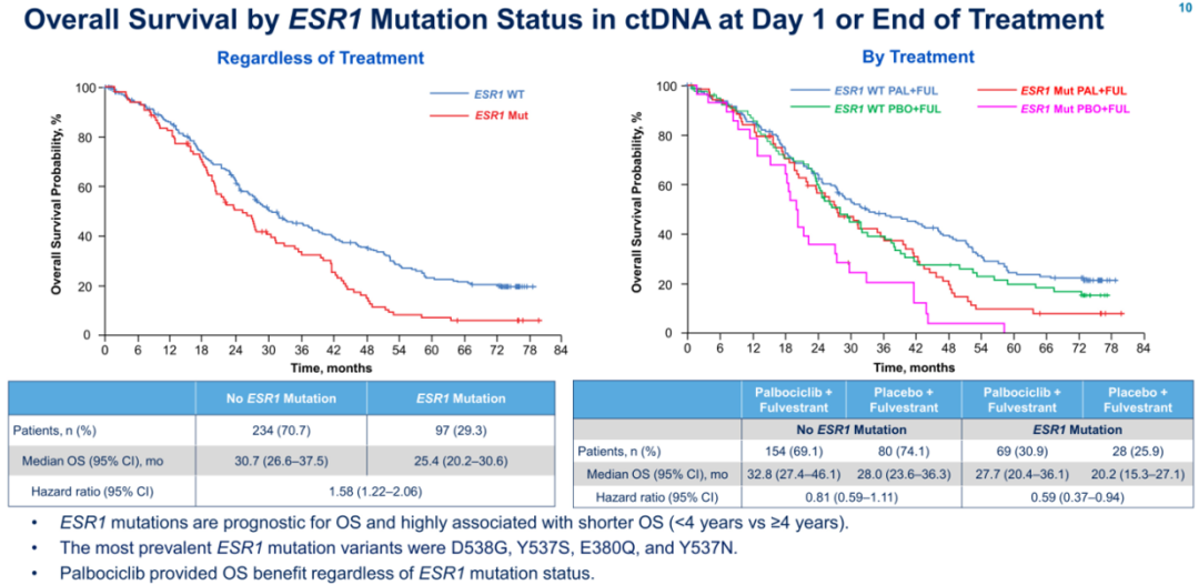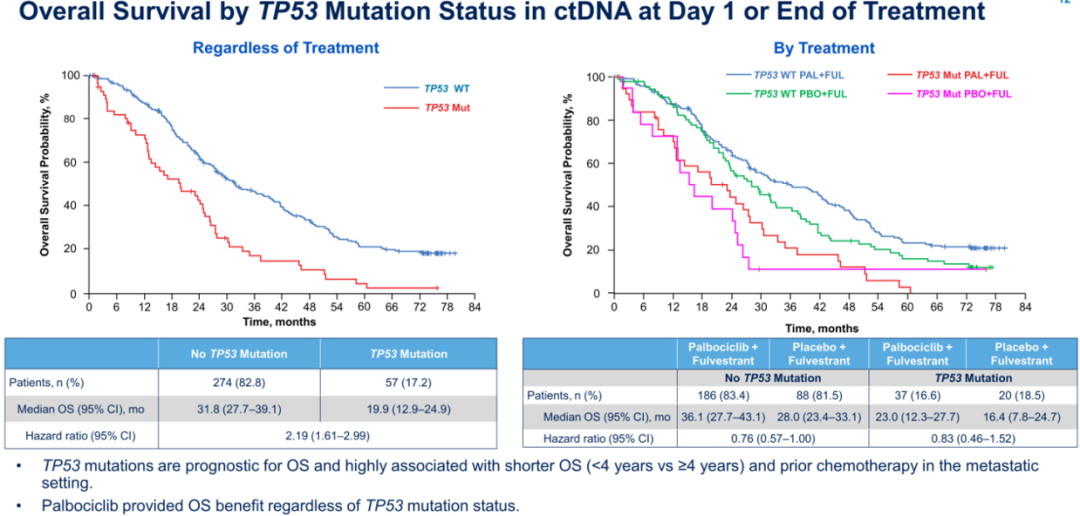 18名患者仍在接受研究治疗,其中15名患者(4.3%)接受PAL+FUL治疗,3名患者(1.7%)接受PBO+FUL治疗。PAL+FUL组20例(7.5%)患者和PBO+FUL组32例(22.2%)患者接受研究后的CDK4/6抑制剂。治疗结束时对肿瘤突变形式(如 ESR1、PIK3CA、RB1)的ctDNA以及其对OS的影响进行了分析。