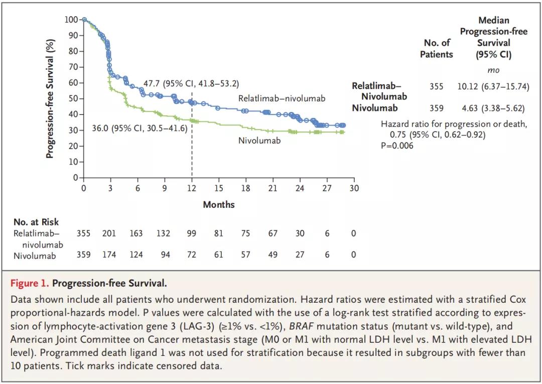 RELATIVITY-047是一项2~3期的全球双盲随机试验,评估了Relatlimab联合Nivolumab作为一种新型固定剂量的联合药物,对比Nivolumab单药治疗之前未经治疗的转移性或不可切除的黑色素瘤患者的疗效。