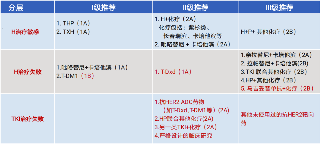这是指南新增的治疗分层,主要基于临床需求、真实世界数据和HER2阳性乳腺癌中国专家共识。由于缺乏适合中国临床的大型研究证据,指南对此类人群尚无I级推荐,主要包括II级推荐:T-DXd、T-DM1等ADC药物,HP联合其他化疗,换用另一类TKI+化疗,参加临床研究;III级推荐:其他未使用过的抗HER2靶向药物。