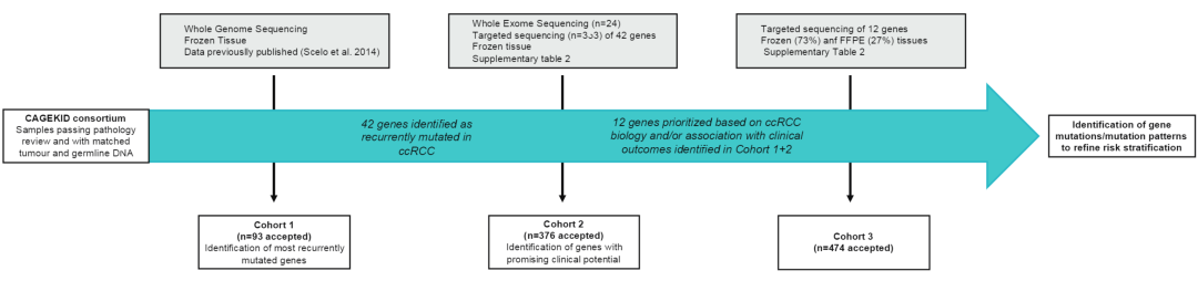 肾癌是高度异质性肿瘤,治疗疗效差异大,缺乏像血前列腺特性抗原,CA199等体液检查指标。手术切除肿瘤作为肾癌的常用手段为肾癌标本组织的研究提供了便利。基于此,2011年5月,欧洲成立了肾脏癌症基因组学(CAGEKID),该研究纳入了欧洲数家中心肾癌手术标本进行基因测序,本研究就是对这些结果的分析。