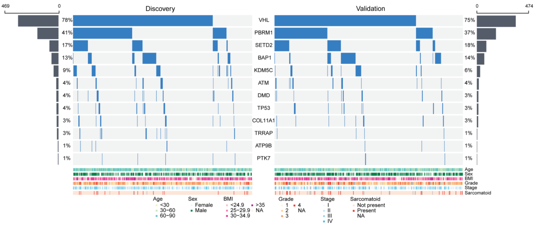 在这些队列中,76.4%的患者存在VHL体细胞突变,VHL是ccRCC中最常见的驱动基因。VHL突变肿瘤中最常见的突变基因是PBRM1(39.7%)、SETD2(19%)、BAP1(14.3%)和KDM5C(8.3%)。突变频率较低的基因包括ATM、COL11A1、DMD、TP53和TRRAP(约3-5%)。