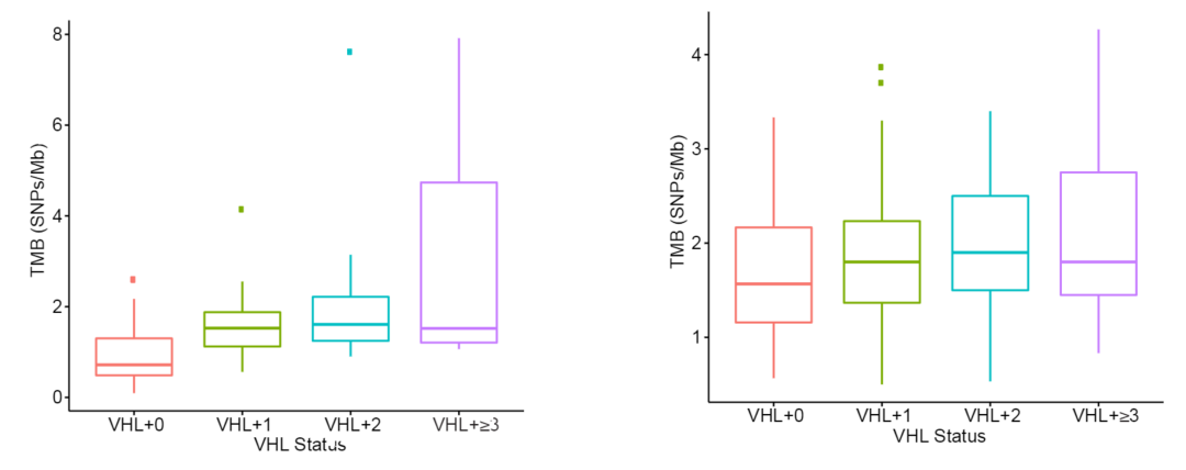 按照分期和年龄进行分层时,相较于VHL+0患者,VHL≥3患者的5年无病生存的风险比为6.69(p=0.000212),VHL+2患者为4.31(p=0.000862),VHL+1患者为2.43(p=0.035662)。这些观察结果在第二个患者队列中重复,VHL≥3、VHL+2、VHL+1的风险比分别为4.55、2.49和1.40,表明疾病复发的风险随着驱动基因突变的数量增加而增加。值得注意的是,上述两组之间的肿瘤突变负荷(TMB)没有显著差异,这表明该分类方法独立于TMB。
