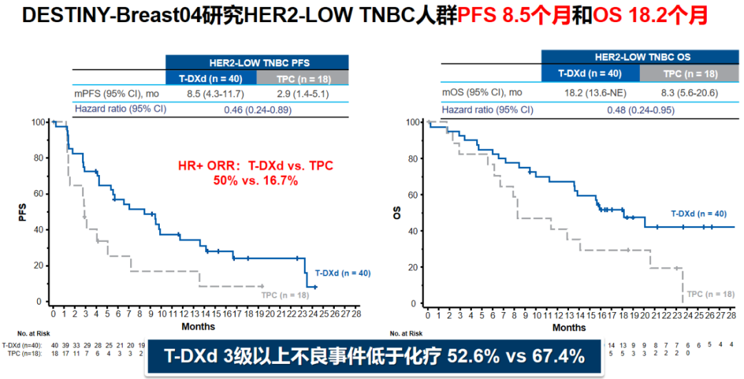 在讲课中,杨谨教授还对HER2- low mTNBC乳腺癌患者治疗的相关研究进行了介绍。ASCENT研究中,SG在HER2- low mTNBC后线治疗中的mPFS为6.2个月,OS达14个月,ORR 32%,提示SG对HER2-low患者有良好的效果,但是该研究患者中性粒细胞减少和腹泻较为明显。DB-04研究显示,T-DXd治疗HER2-low mTNBC可获得8.5个月的PFS和18.2个月的OS,且≥3级的AE低于化疗组。因此,较高的稳定偶联体系,精准的靶向递送以及较低的毒性使得T-DXd成为HER2-low mTNBC治疗新选择。