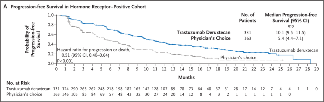 研究结果显示,HR+患者中,DS-8201的mPFS为10.1个月,化疗组的5.4个月。DS-8201可降低HR阳性HER2低表达mBC患者49%的疾病进展或死亡风险(HR=0.51;95%CI:0.40-0.64;p<0.001)。