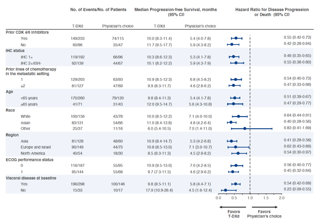 在所有HR+的受试者中,DS-8201组有70.4%的患者为CDK4/6抑制剂经治,TPC组有70.6%,试验组与对照组的基线情况保持高度一致。对于这部分人群,从亚组分析中我们看到,mPFS为10.0m vs 5.4m,HR 0.55(95%CI:0.42-0.73),可降低疾病进展/死亡风险45%。