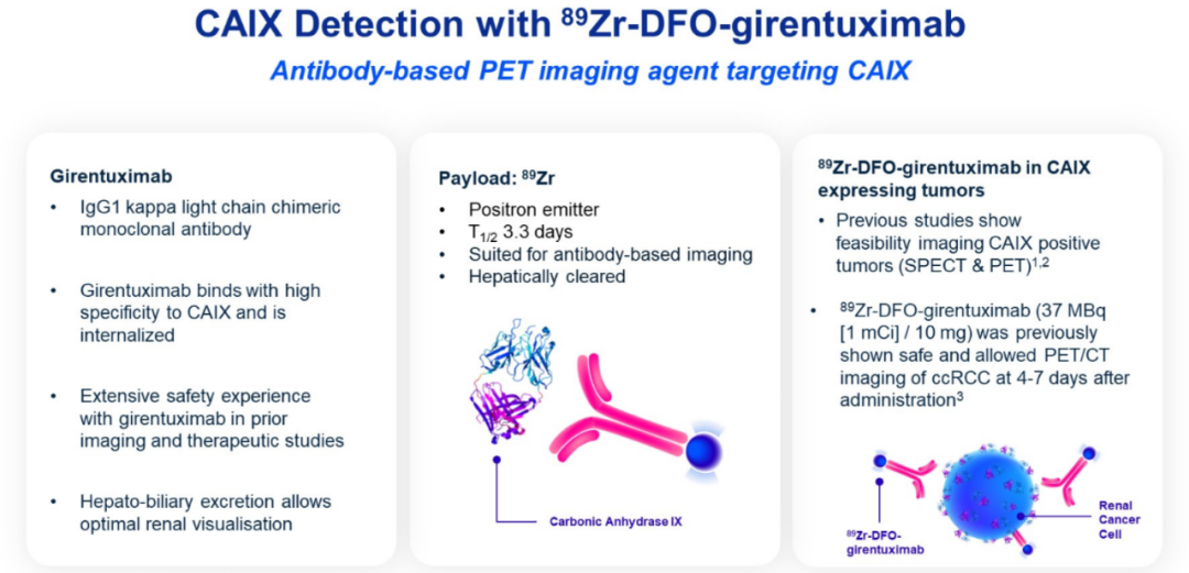 89Zr-DFO-girentuximab(TLX250-CDx)是一种抗体偶联药物(ADC),也是一种放射性抗体偶联物(RDC)。其中,girentuximab是靶向于CAIX的特异性抗体,89Zr则是具有放射性标记的载荷,二者由DFO偶联而成。既往研究显示,89Zr-DFO-girentuximab可靶向标记于CAIX阳性肿瘤(SPECT和PET),呈现出稳定的成像特征,并确定了37MBq(1 mCi)/10mg的89Zr-DFO-girentuximab用于PET/CT成像(注射用药后4-7天)是安全的。这项3期ZIRCON研究旨在进一步扩大样本,评价该RDC用于ccRCC的诊断效能和安全性。