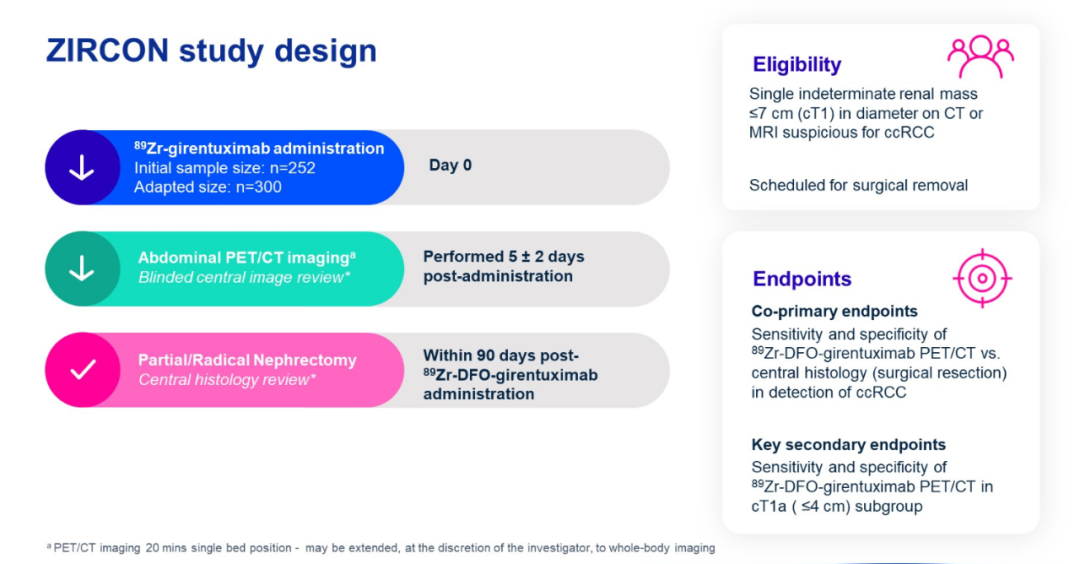 ZIRCON是一项全球多中心、开放标签的临床试验,入组cT1(≤7cm)、拟行肾部分切除术的肾肿瘤患者,在术前7天内(D0)接受89Zr-DFO-girentuximab注射用药,5±2天后进行PET/CT检查,在89Zr-DFO-girentuximab给药后90天内,根据中心组织病理回顾而接受肾部分切除或根治性肾切除。主要终点是整体人群中89Zr-DFO-girentuximab PET/CT诊断的敏感性和特异性(3次独立阅片);次要终点是cT1a(≤4cm)亚组患者的敏感性和特异性。