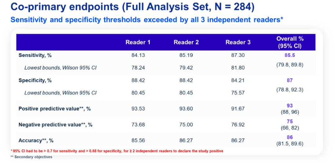 研究结果显示达到了主要终点,在284例全分析人群中,89Zr-DFO-girentuximab诊断ccRCC的敏感性为85.5%(95%CI:79.8%~90%),特异性为87%(78.8%~92.3%),达到了预设的显著性界限(敏感性和特异性的95%CI下限分别为>70%和>68%);阳性预测值(PPV)和阴性预测值(NPV)分别为93%和75%;准确性为86%。