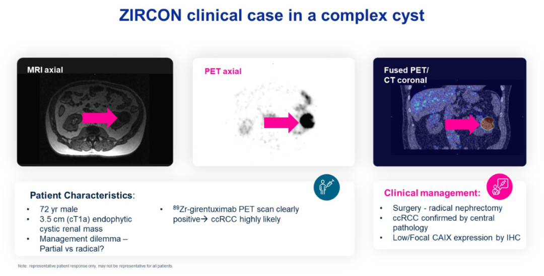 这是一例72岁老年男性,MRI显示为3.5cm(cT1a)左肾内生型囊性占位,这种囊性占位在体积较小时很难通过CT或MRI进行鉴别诊断,也难以通过穿刺活检明确诊断。89Zr-DFO-girentuximab PET显示为阳性病灶,即有可能为ccRCC。患者在接受根治性肾切除术后,病例确认为ccRCC,免疫组化(IHC)显示为低/局灶CAIX表达。