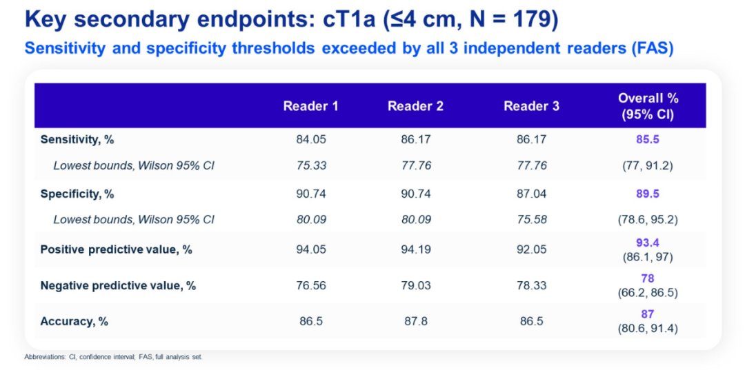 关键次要终点方面,在179例cT1a患者中,89Zr-DFO-girentuximab诊断ccRCC的敏感性为85.5%(77%~91.2%),特异性为89.5%(78.6%~95.2%);PPV和NPV分别为93.4%和78%;准确性为87%。
