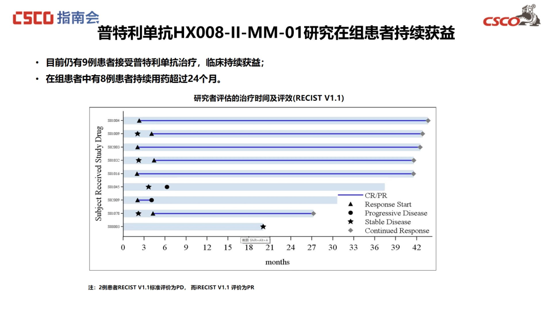 截至2022年10月24日,研究入组119例患者,已知8例失访,剩余101例患者中,仍有41例存活,2年生存率高达39%;约25%的患者治疗持续时间(DOT)超过12个月;目前仍有9例患者接受普特利单抗治疗,临床持续获益;在组患者中有8例患者持续用药超过24个月。