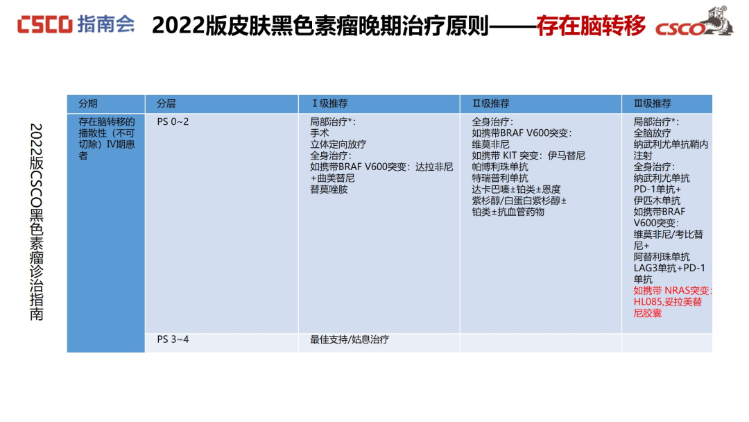 对于无脑转移的患者,“替莫唑胺+阿帕替尼+卡瑞利珠单抗”由原来的一线Ⅲ级推荐前移至Ⅱ级推荐,“如携带NRAS突变,建议采用妥拉美替尼胶囊(HL-085)治疗”由原来的二线Ⅲ级推荐前移至Ⅰ级推荐,Ⅱ级推荐新增“普特利单抗”;相同的更新也见于存在脑转移且PS评分0~2的患者。