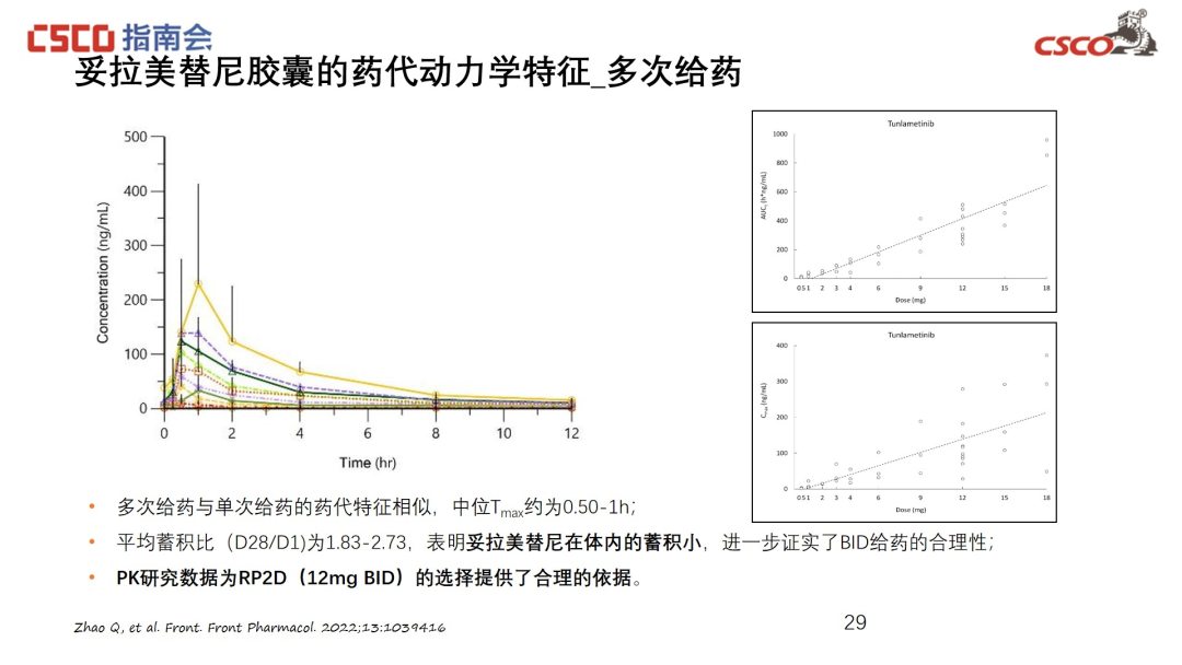 单次给药后,妥拉美替尼在体内快速吸收达峰,Tmax约为0.50~1h,t1/2约为21.84~34.1h;爬坡剂量范围内(0.5~18mg,bid),血药暴露(Cmax和AUC)与剂量呈近似线性关系。多次给药与单次给药的PK特征相似,中位Tmax约为0.50~1h;平均蓄积比(D28/D1)为1.83~2.73,表明妥拉美替尼在体内的蓄积小,进一步证实了bid给药的合理性;PK研究数据为RP2D(12mg,bid)的选择提供了合理的依据。