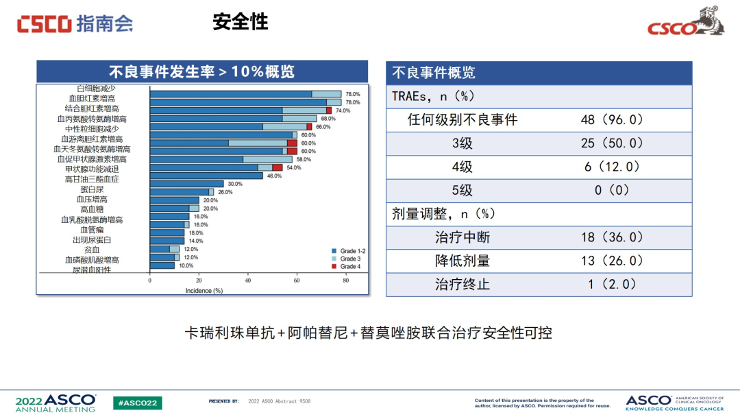 结果显示患者ORR为66.7%(95%CI:51.6~79.6),中位PFS为18.4个月(95%CI:10.6~未达到),DCR为91.7%(95%CI:80.0~97.7),中位OS未达到。治疗相关不良事件(TRAEs)的发生率为96%(48/50),没有发生与治疗相关的死亡,治疗安全性可控。卡瑞利珠单抗+阿帕替尼+替莫唑胺联合一线治疗晚期肢端黑色素瘤的疗效良好,且患者有较好的耐受性。