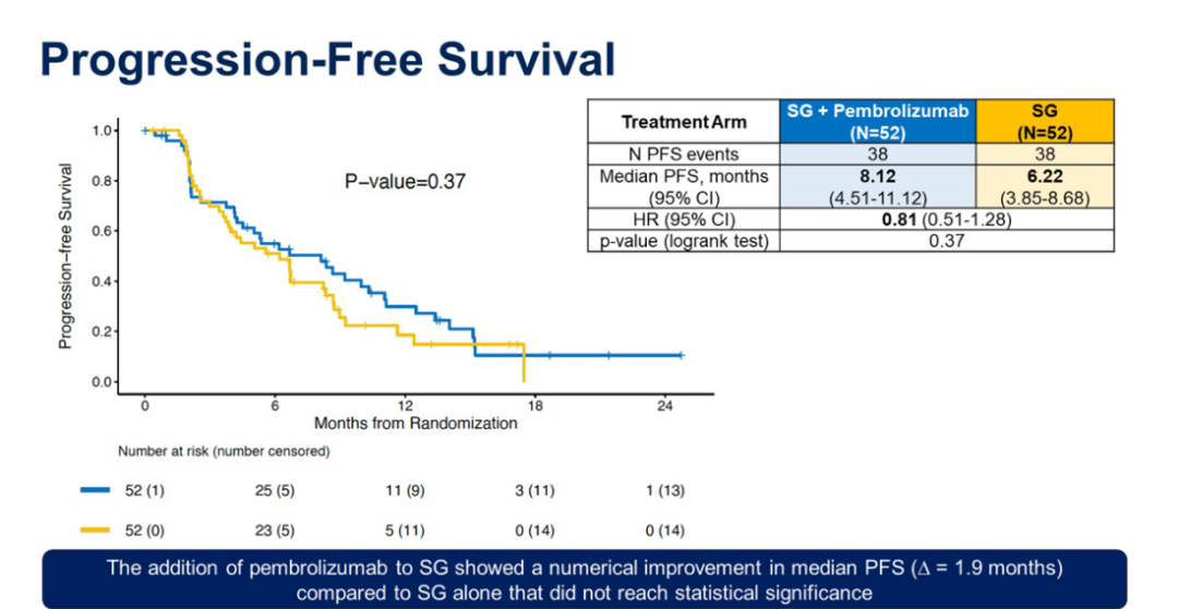 在HR+/HER2-乳腺癌中,ADC联合免疫治疗的SACI-IO临床研究,其结果显示SG联合帕博利珠单抗对比SG并没有显著改善疗效,亚组分析中PD-L1阳性人群PFS和OS有获益的趋势,但无统计学意义,OS数据不成熟,需要进一步随访。本研究中SG联合帕博利珠单抗的安全性与两种药物的预期安全性相似,未报告新的安全性信号。HR+/HER2-晚期乳腺癌可能存在免疫治疗获益的内在亚型,需进一步探索HR+/HER2-晚期乳腺癌ADC联合免疫治疗策略获益的预测因素。